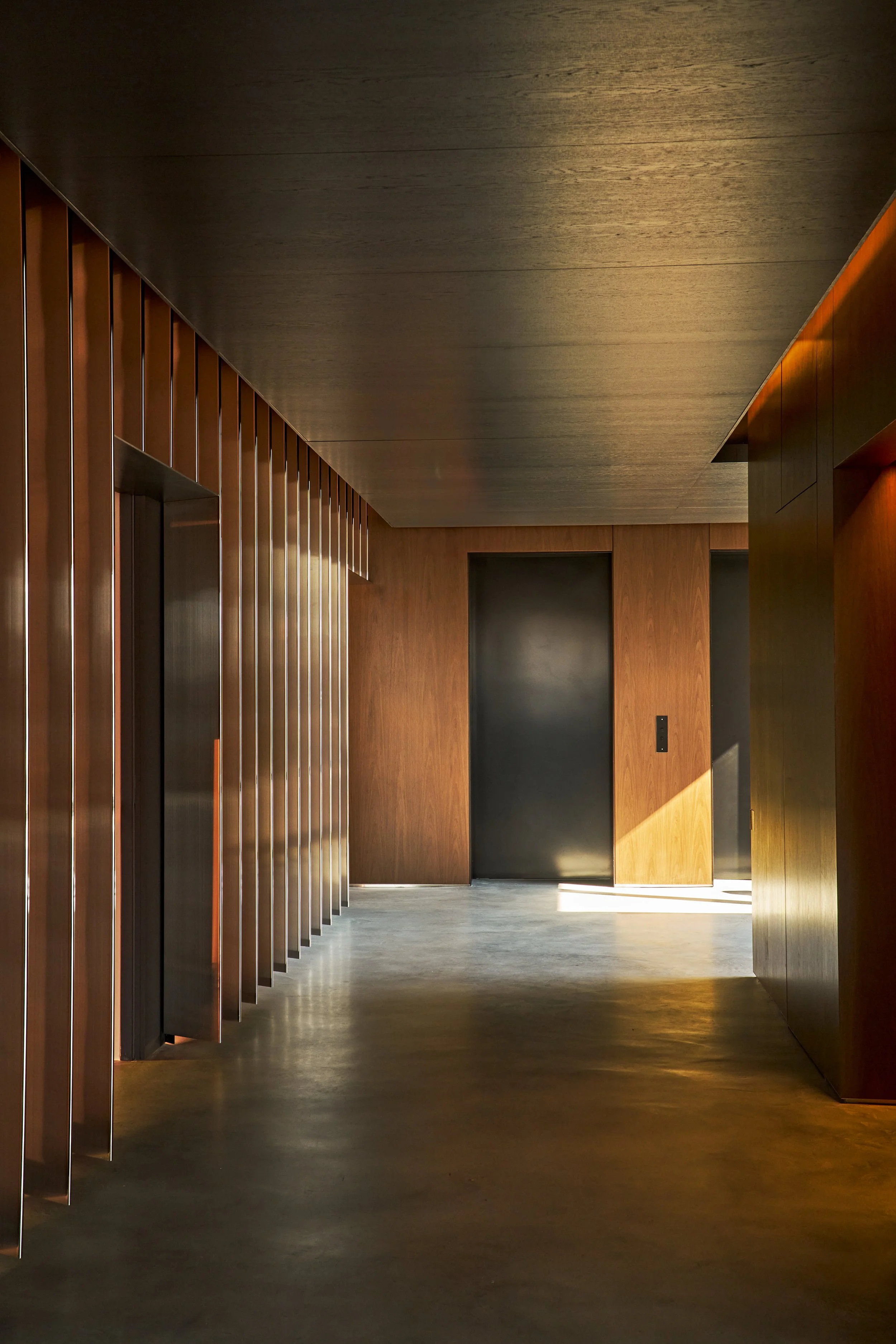 Polished steel columns, inspired by the Rolls Royce Pantheon grille, gently catch the sunset as it moves across the Hudson River. A soft, waterfall-like lighting feature follows guests through the corridor, adding a sense of quiet movement as they transition into the main space. Inside, exposed brick reflects the character of New York’s row houses, while lavender and wildflowers in handcrafted wooden planters bring in something of the West Sussex countryside.