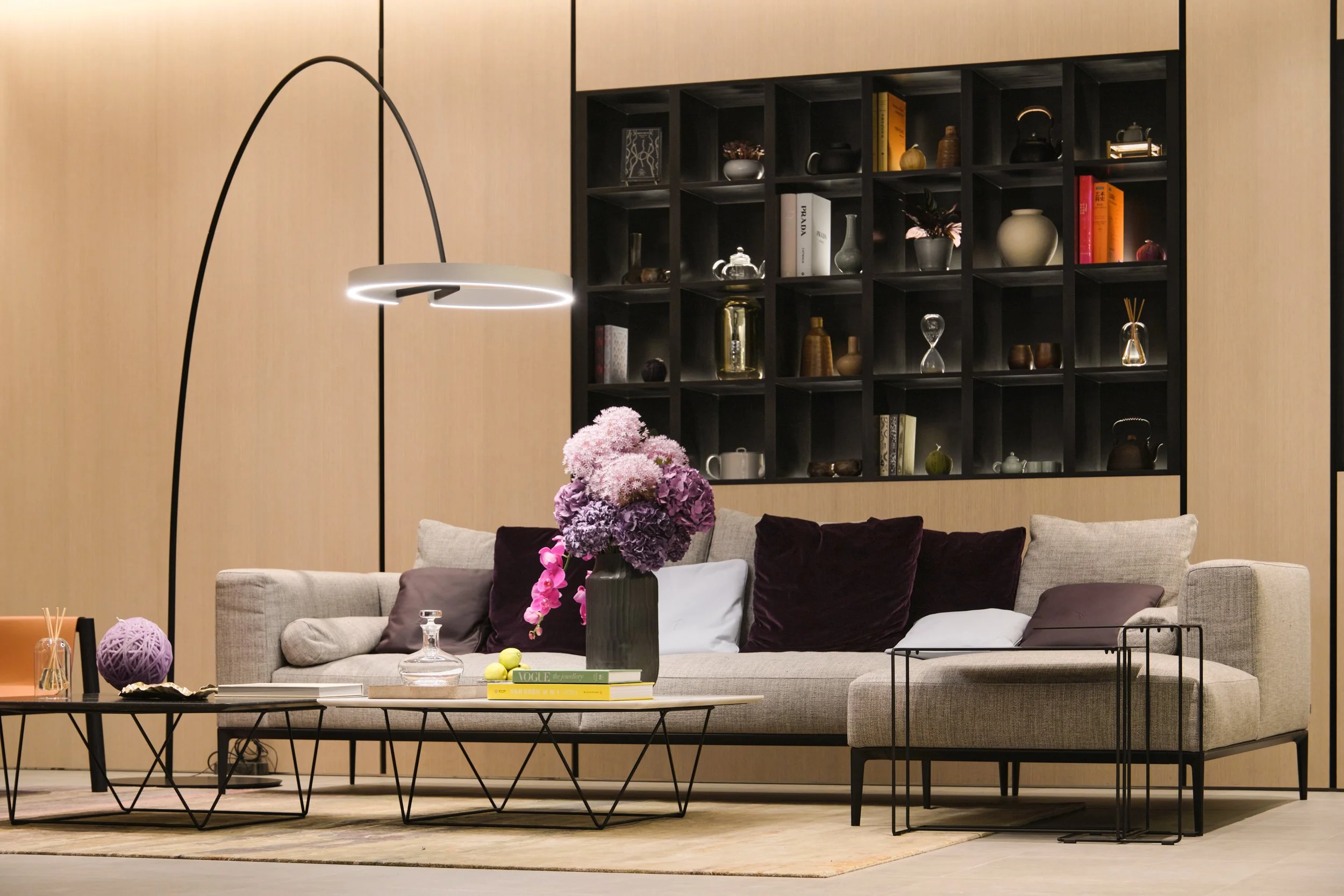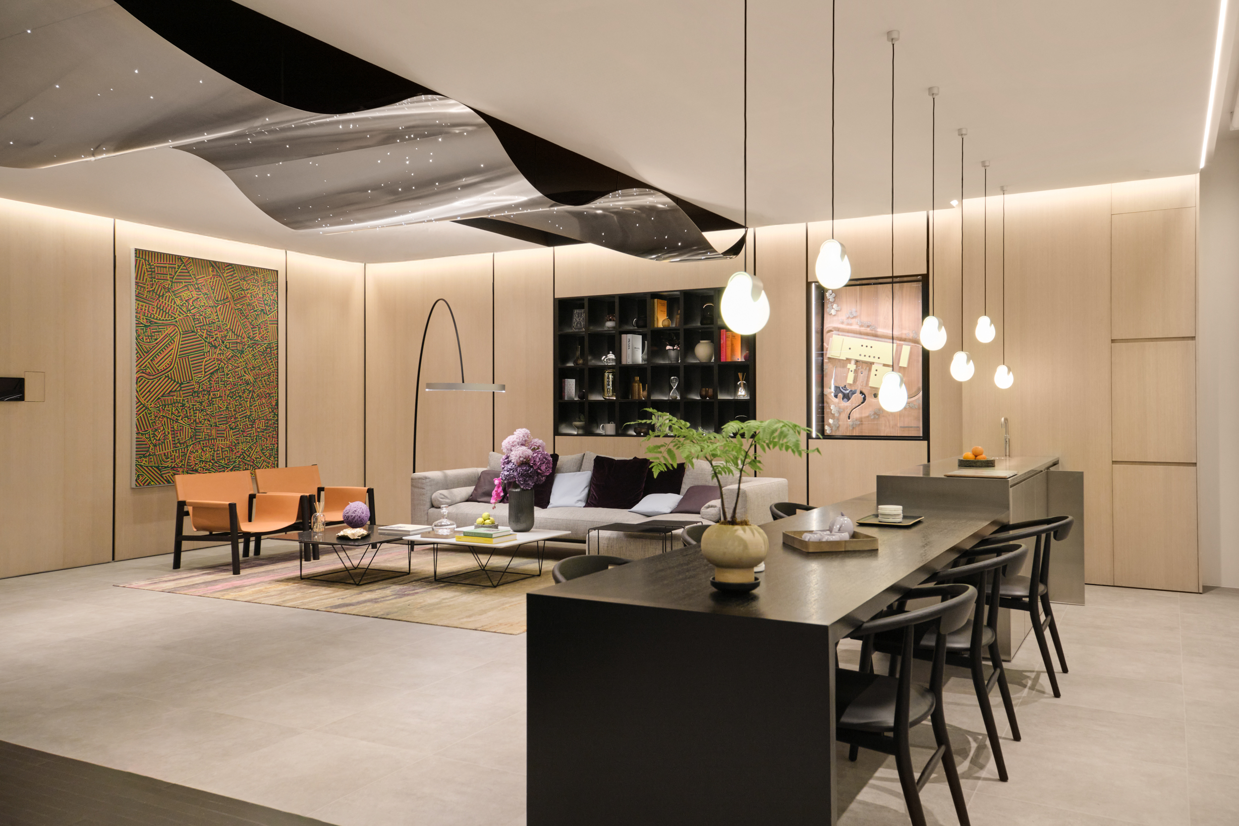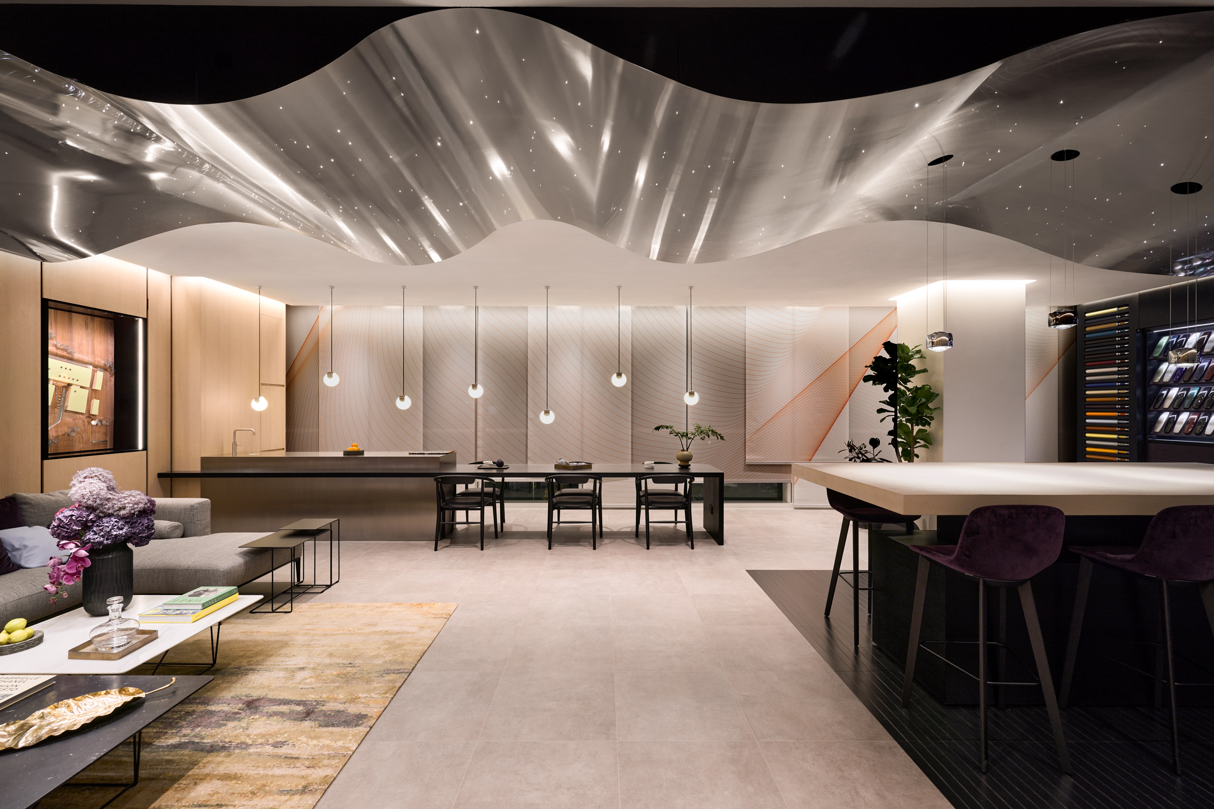 One of the standout materials was Laurameroni’s carved wood panelling. Its deep, blade-like cuts reimagined traditional Chinese woodworking in a more contemporary way, reflecting the brand’s ongoing relationship with craftsmanship. Lighting was also tailored to the setting. We included a pendant by local studio Notion Studio & Offhand Practice, which took its form from Tang Yuan (a traditional Chinese sweet), and gave the space a soft, sculptural touch.